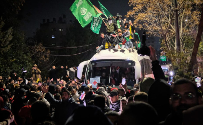 Les bus transportant les prisonniers palestiniens libérés sont entourés par une foule en liesse. Nombreux sont ceux qui ont attendu plus de dix heures que leurs proches soient libérés des prisons israéliennes, dans le cadre du premier échange de prisonniers prévu par l'accord de cessez-le-feu entre Israël et le Hamas - Ramallah,  chroniquepalestine.com occupée, 19 janvier 2025 - Photo : Qassam Muaddi