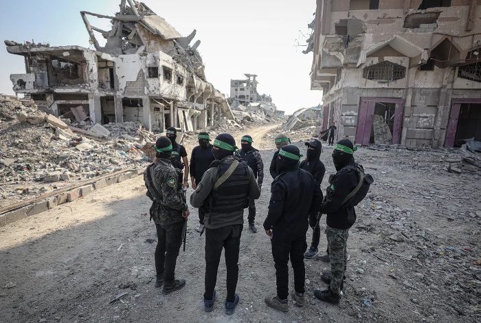 5 novembre 2025 - Combattants des Brigades al-Qassam, l'aile armée du Hamas [résistance islamique] dans les environs de ce qui subsiste de la rue Baghdad à Gaza - Photo : Hamza Z. H. Qraiqea / AA