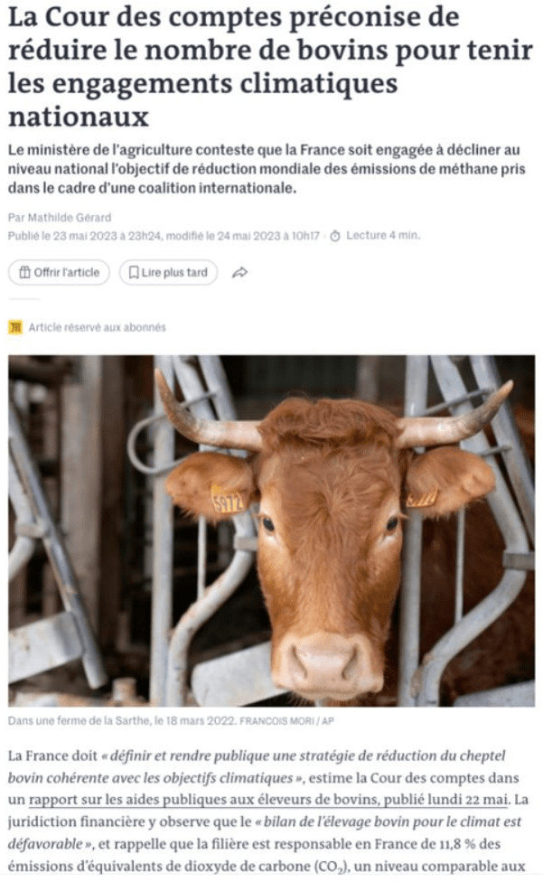 • La Cour des comptes préconise depuis 2023 la réduction du cheptel bovin en France au nom de la «raison climatique» :