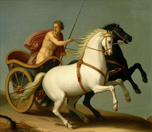Dans Phèdre, Platon décrit la cause de la chute de l'âme dans le corps comme une conséquence de la révolte du cheval noir. Alors que le cheval blanc obéit à la voix du conducteur, le cheval noir ne le fait pas, et cherche constamment à aller dans une direction opposée à celle de l'intellect. L'âme tombe dans le corps et perd ses ailes précisément à cause d'une impulsion centrifuge intrinsèque en elle-même, incarnée dans le cheval noir, dans la propriété du désir. Il n'y a pas de ligne de démarcation stricte entre le désir et le corps; le corps lui-même est le désir devenu pierre.