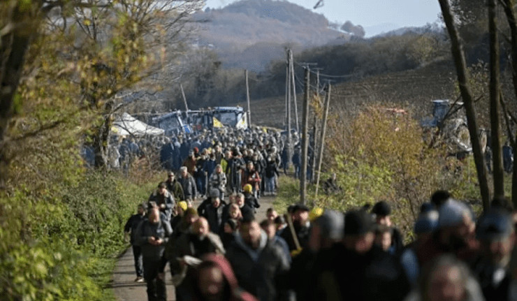 Illustration : Des manifestants marchent vers un barrage routier lors d'une manifestation contre l'abattage d'un troupeau de 200 vaches, suite à la détection de la maladie de la peau bosselée (LSD) à Les-Bordes-sur-Arize, dans le département de l'Ariège, dans le sud-ouest de la France, le 11 décembre 2025.