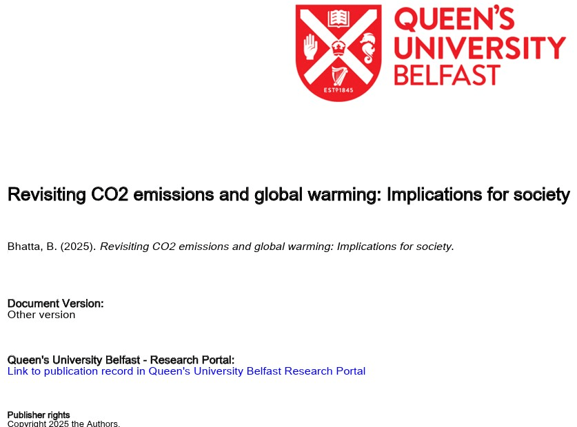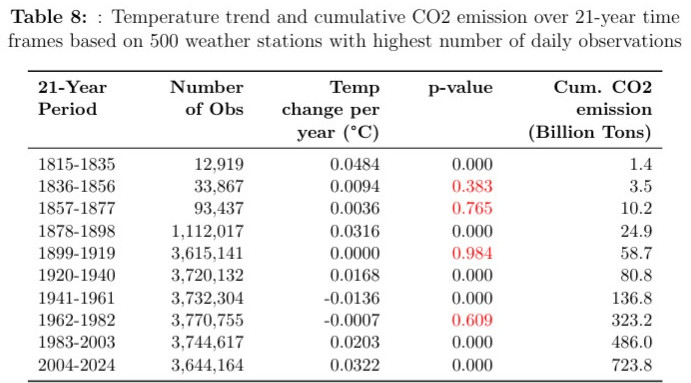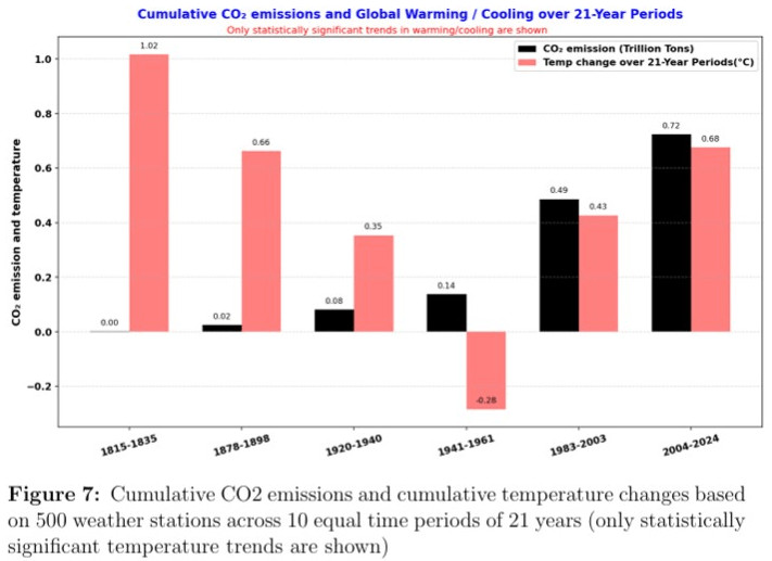 Cependant, l'examen direct des données de température journalières publiques provenant des stations météorologiques ne confirme pas l'idée que le CO₂ soit le principal facteur du réchauffement climatique. Si tel était le cas, les périodes de fortes émissions de CO₂ connaîtraient un réchauffement plus rapide que les périodes de faibles émissions. Or, cette étude révèle que certaines périodes récentes ont été marquées par un refroidissement global malgré une forte augmentation des émissions de CO₂. De plus, la hausse des températures à long terme a été plus marquée lors des périodes antérieures où les émissions de CO₂ étaient modestes, comparativement aux niveaux actuels.