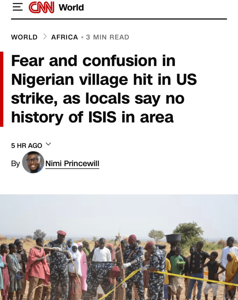 Bushra Shaikh, commentatrice britannique, a dénoncé l'opération sur X : «Si l'objectif était vraiment de protéger les chrétiens, la CIA aurait au moins visé le bon endroit. Tout cela semble bidon» ! De nombreux observateurs partagent ce scepticisme. Le gouvernement nigérian défend l'intervention conjointe anti-terroriste. Trump insiste sur la menace contre les minorités chrétiennes dont il ignore les souffrances et les morts causées par l'entité sioniste ! Cependant, le village de Jabo, majoritairement musulman, n'a jamais été associé à l'ISIS ou à Lakurawa. Cette frappe ravive les critiques contre les interventions américaines en Afrique. Elle rappelle les erreurs passées de drones qui ont parfois touché des civils innocents, des mariages...