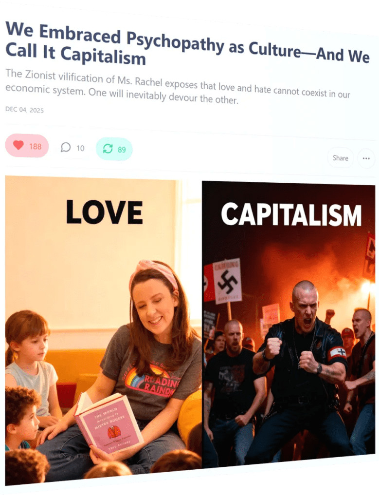 La machine politique sioniste a resserré son emprise sur les instruments de perception elle-même. TikTok, la plateforme sur laquelle les jeunes Américains regardaient en temps réel Israël commettre des atrocités que leurs réseaux d'information refusaient de montrer, a été  rachetée par des alliés de l'État israélien. CBS, l'un des derniers vestiges de l'information en réseau,  est tombé entre des mains similaires. L'infrastructure de l'information - le moyen même par lequel une société sait ce qui est réel - est systématiquement absorbée par ceux qui ont tout intérêt à rendre le génocide au moins invisible et au mieux acceptable.