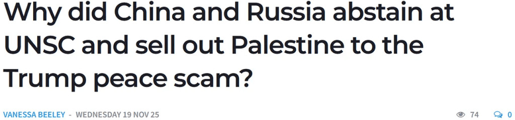 Filles palestiniennes. Des dizaines de milliers - peut-être des centaines de milliers - d'orphelins qui ont désespérément besoin d'amour, de sécurité, d'un seul adulte qui ne leur fera pas de mal. Et maintenant, le Conseil de sécurité de l'ONU - avec le consentement de la Russie et de la Chine - a confié ces enfants, ces centaines de milliers d'orphelins en mal d'amour, aux associés de Jeffrey Epstein et à un État dont les soldats violent les prisonniers sous les applaudissements des ministres. La transaction est terminée.