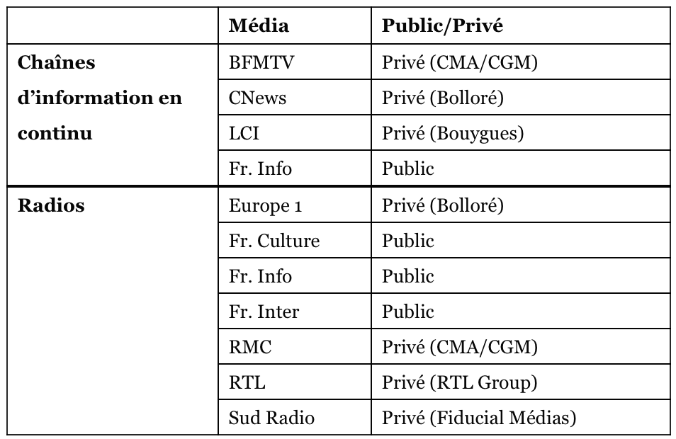 Tableau 1 : Liste des chaînes de télévision et de radios analysées par l'outil de détection des mots de l'INA.