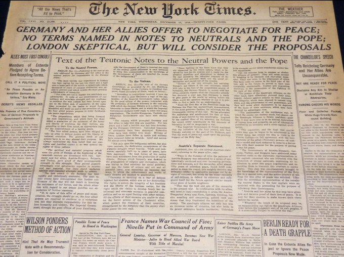 I suspect that even most professional Western historians would today be shocked and mystified by the banner headlines in the December 23, 1916 edition of the New York Times announcing that dramatic German peace offer: