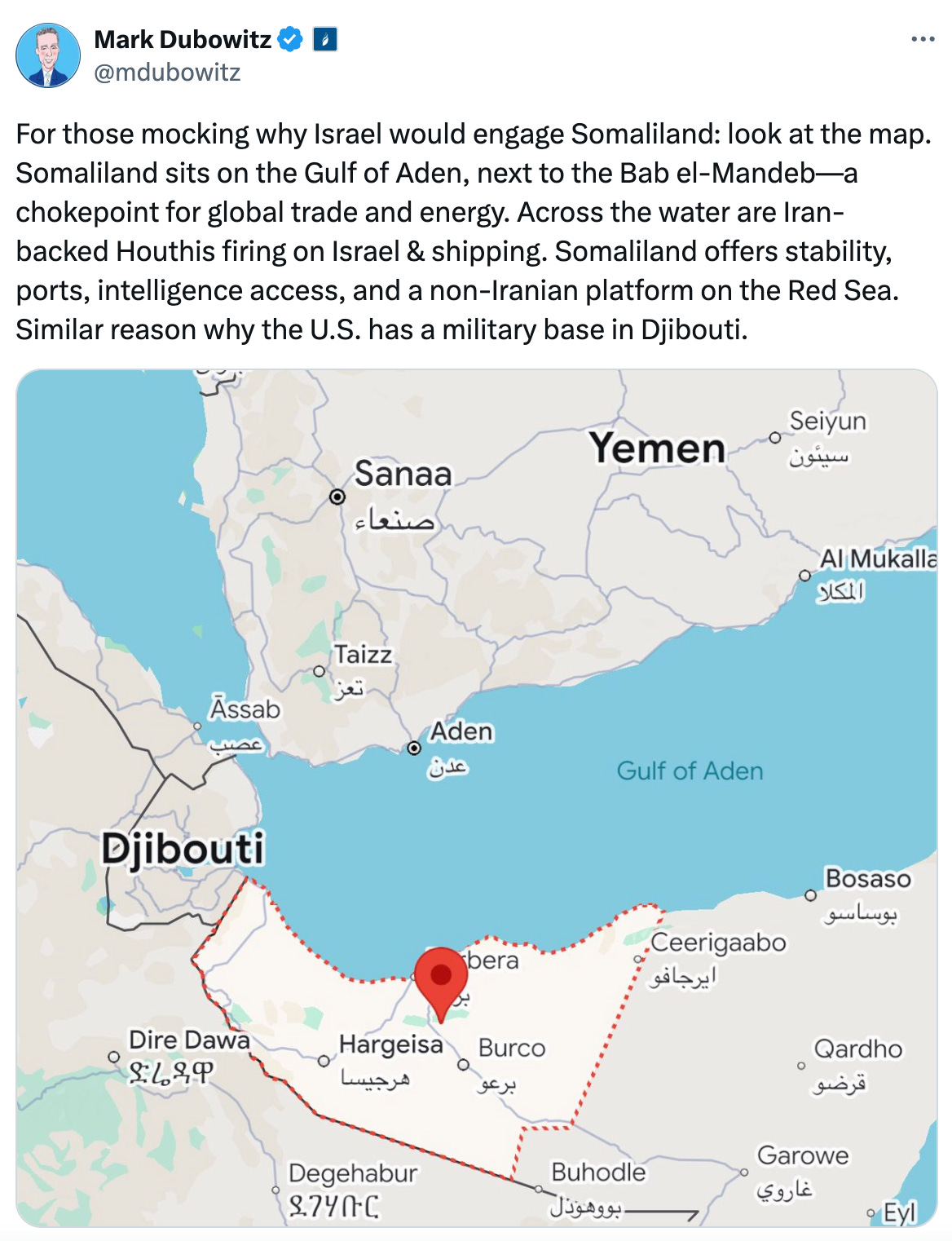 Trad.: À ceux qui se moquent des raisons pour lesquelles Israël s'engagerait au Somaliland : regardez la carte. Le Somaliland est situé sur le golfe d'Aden, à proximité du détroit de Bab el-Mandeb, un point de passage stratégique pour le commerce et l'énergie mondiaux. De l'autre côté du détroit, les Houthis, soutenus par l'Iran, bombardent Israël et ses navires. Le Somaliland offre stabilité, ports, accès aux services de renseignement et une plateforme non iranienne sur la mer Rouge. C'est une raison similaire qui explique la présence d'une base militaire américaine à Djibouti.