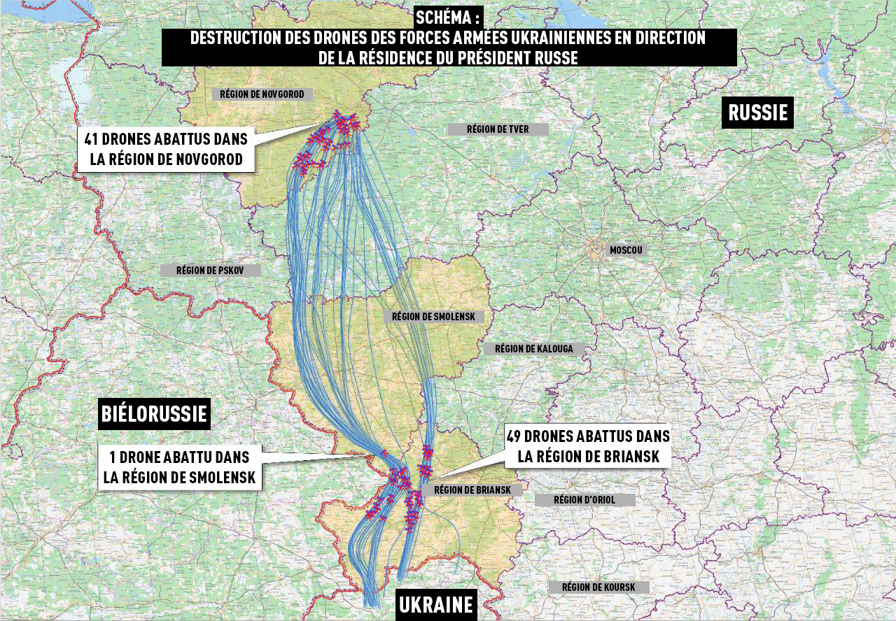 Le ministère russe de la Défense a détaillé l'acte terroriste de Kiev avec 91 drones visant la résidence de Vladimir Poutine à Novgorod, mise en échec par la défense aérienne. Le commandement russe a décrit une opération soigneusement planifiée et échelonnée, montrant les trajectoires des drones ukrainiens, complétées par des images des débris.