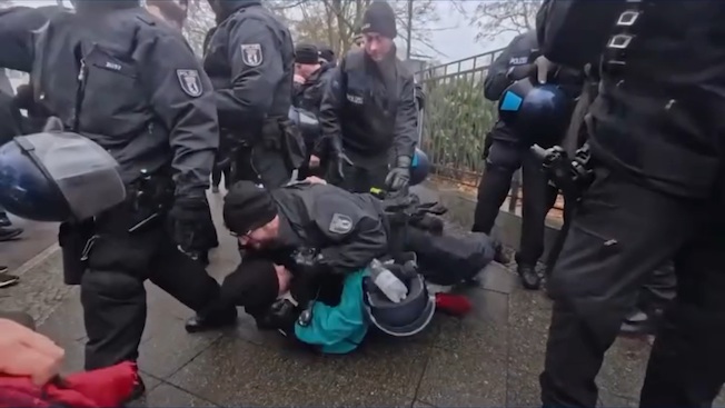 Répression policière à Berlin lors d'une manifestation devant l'hôtel de ville de Neukölln. Regardez comme la police allemande attrape n'importe qui au hasard. Le but est visiblement de terroriser et de dissuader de manifester. Mais cela ne marche pas