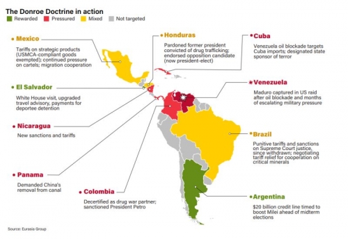 Il a également été question de la doctrine Monroe dans sa version renouvelée, ce qui signifie en pratique que tous les pays de l'hémisphère occidental doivent se soumettre aux ordres de Washington.