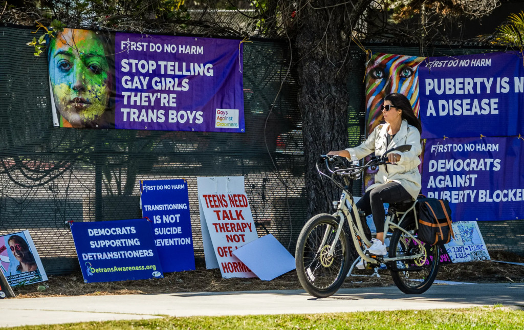 Des militants pour la détransition se réunissent à l'extérieur du congrès annuel de la Société d'endocrinologie pédiatrique qui se tient à San Diego le 6 mai 2023. John Fredricks/The Epoch Times