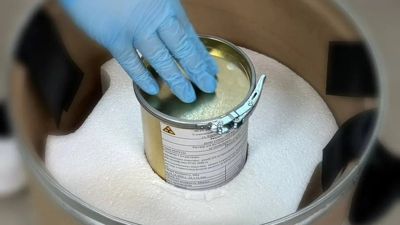 Le médicament anticancéreux russe «Rakours 223Ra», placé dans un conteneur spécial. [Crédit : Agence fédérale médico-biologique]