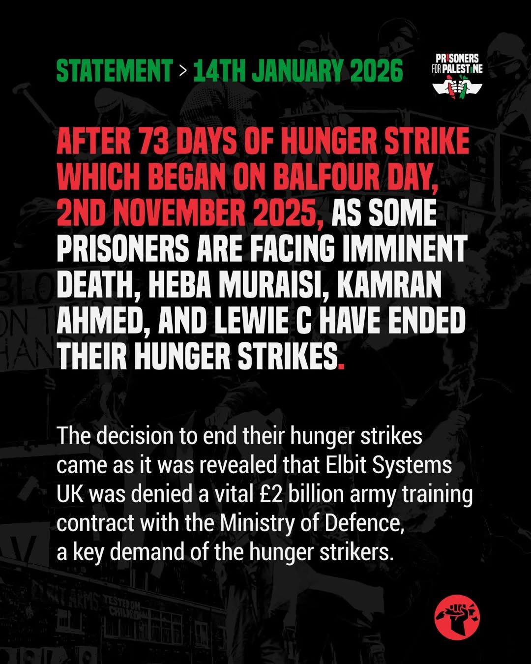 « La grève de la faim de nos prisonniers restera dans les mémoires comme un moment historique de pure défiance, une source d'embarras pour l'État britannique », a déclaré le groupe. « Elle a révélé au monde entier que la Grande-Bretagne détient des prisonniers politiques au service d'un régime étranger génocidaire, et a incité des centaines de personnes à s'engager à mener des actions directes dans le sillage des prisonniers. »