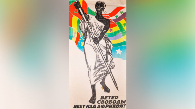 Affiche, créée en 1961, dédiée au défilé des souverainetés sur le continent africain. L'inscription sur l'affiche dit : « Le vent de la liberté souffle sur l'Afrique !