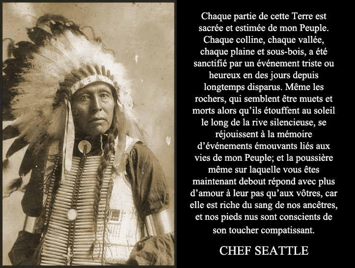Les morts des hommes blancs, lorsqu'ils se promènent au milieu des étoiles, oublient leur terre natale. Nos morts n'oublient jamais la beauté de cette terre, car elle est la mère de l'homme rouge ; nous faisons partie de cette terre comme elle fait partie de nous. Les fleurs parfumées sont nos sœurs, le cerf, le cheval, le grand aigle sont nos frères ; les crêtes des montagnes, les sucs des prairies, le corps chaud du poney, et l'homme lui-même, tous appartiennent à la même famille.