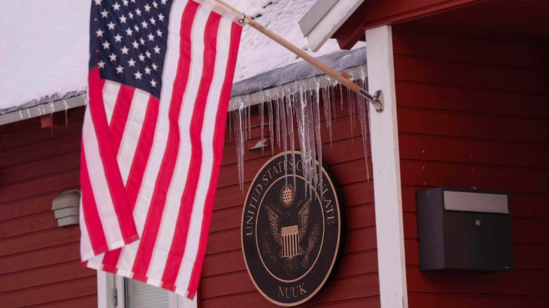 Un drapeau américain est déployé sur la façade du consulat américain à Nuuk, au Groenland, le 14 janvier 2026.