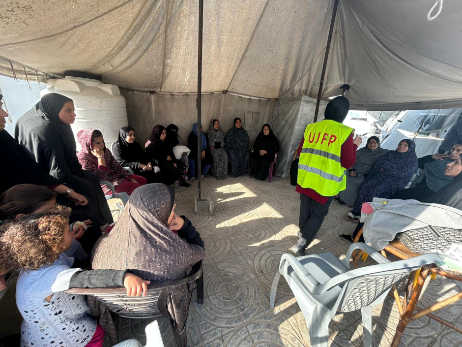 La séance de soutien psychologique mise en œuvre par l'équipe de l'UJFP dans le camp d'Al-Ard Al-Katiba, à l'ouest de la ville de Gaza, en présence de 30 femmes déplacées : Malgré le déplacement, nous sommes plus fortes, notre voix, c'est la vie.