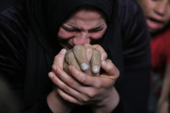 3 avril 2026 - Une femme pleure sur le corps d'un proche tué lors des frappes israéliennes nocturnes sur le nord de Gaza, à l'hôpital arabe Al Ahli de Gaza - Photo : Omar Ashtawy