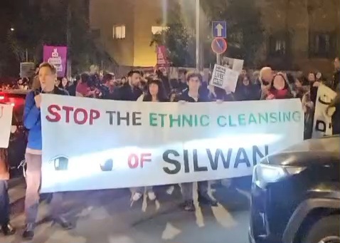 Manifestation de militants israéliens anticolonialistes devant la maison du maire de Jérusalem Moshe Leon, pour protester contre l'expulsion en cours des familles palestiniennes à Silwan et dans d'autres quartiers de la ville.
