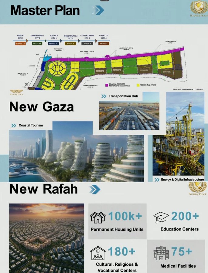 Le Projet de Trump et de ses complices, renommé Conseil de la Paix pour Gaza, se précise : un plan d'ensemble, une nouvelle Gaza, une nouvelle Rafah, et même un aéroport flambant neuf, après élimination de la population palestinienne indigène par la mort, le parcage dans certaines zones ou l'exil forcé.