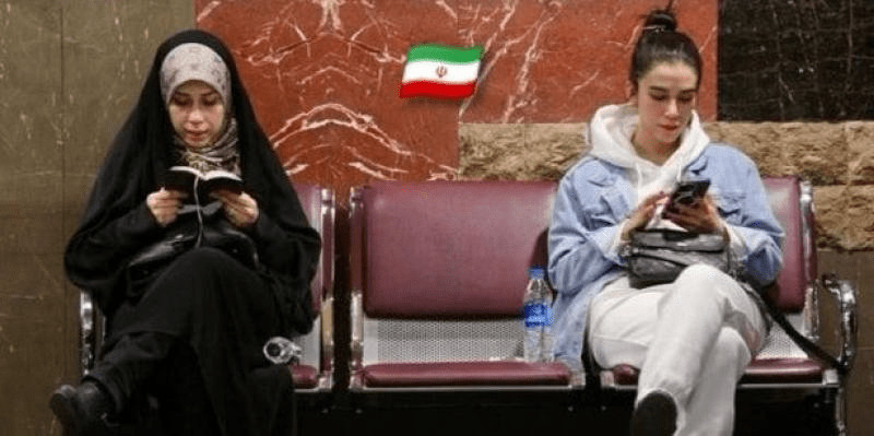 Deux femmes iraniennes, l'une portant le hijab et l'autre non (Téhéran, 2023).