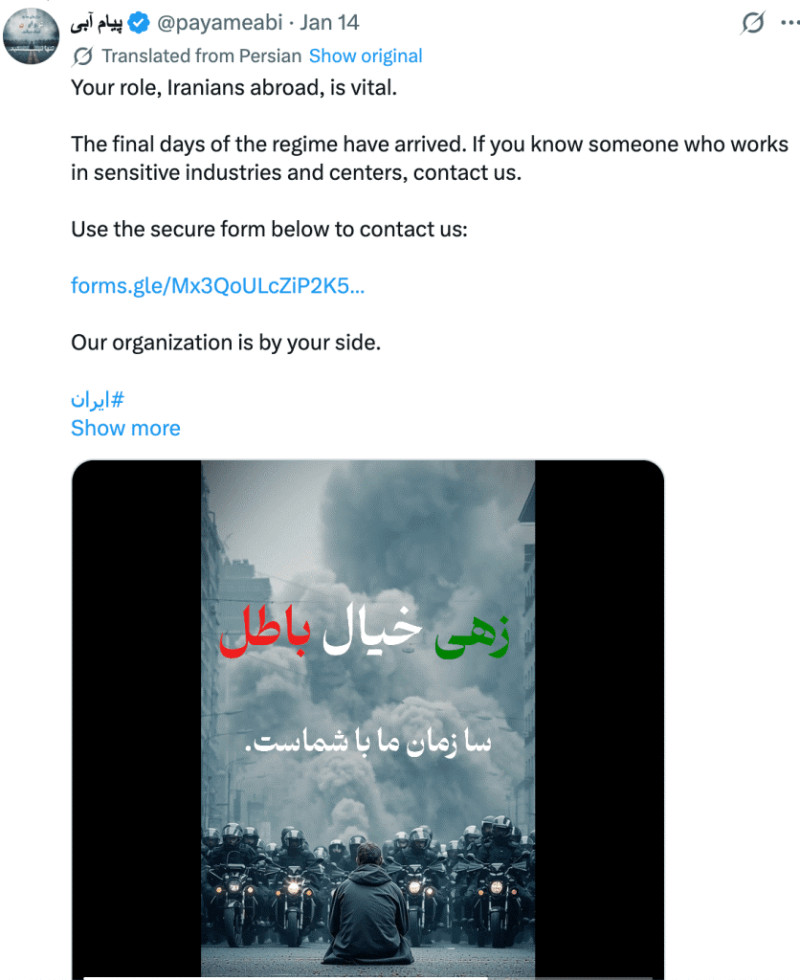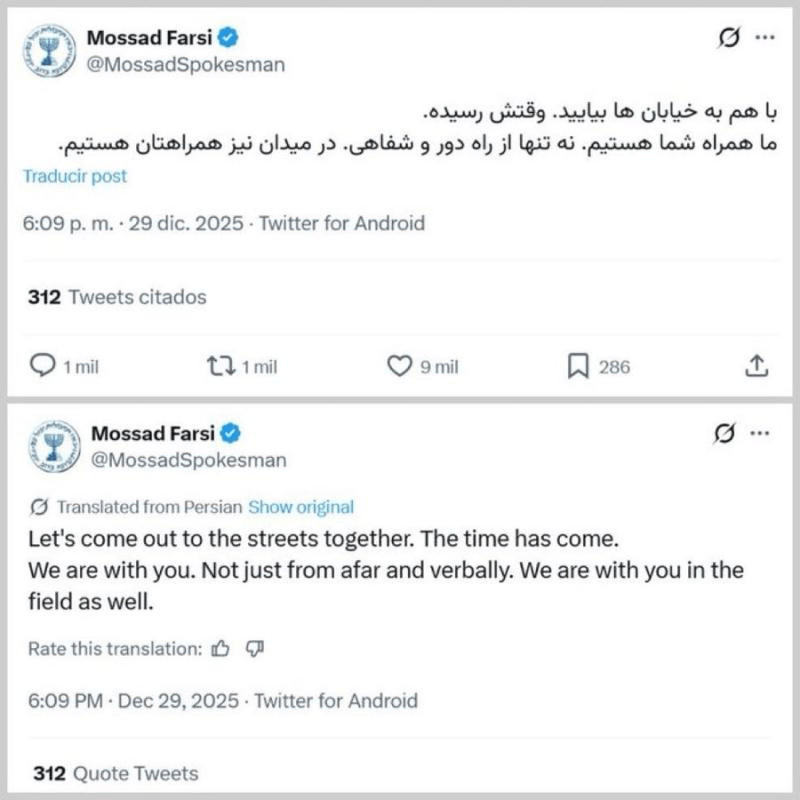 Les opérations psychologiques ont commencé le 29 décembre 2025, au début des manifestations encore modestes, lorsque le Mossad a publié un message en persan sur les réseaux sociaux : «Sortons ensemble dans la rue. Le moment est venu. Nous sommes avec vous. Pas seulement de loin et verbalement. Nous sommes également avec vous sur le terrain».