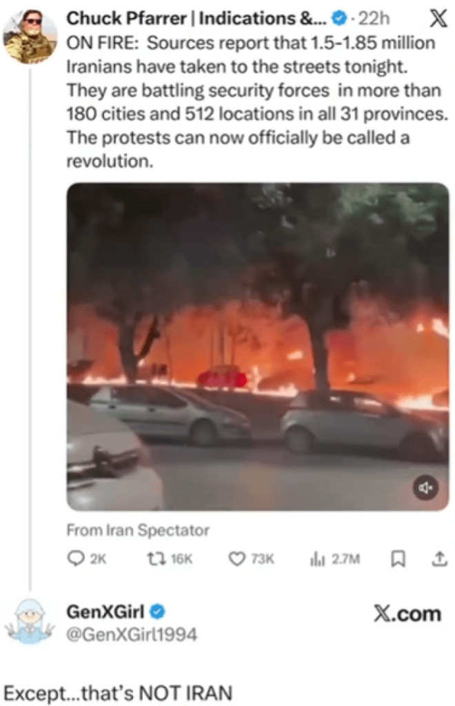 Une publication virale sur X, vue 2,7 millions de fois, a diffusé des informations mensongères, utilisant des vidéos de manifestations dans d'autres pays et les présentant à tort comme des scènes tournées en Iran.