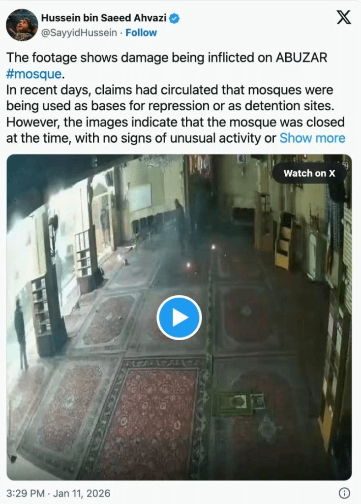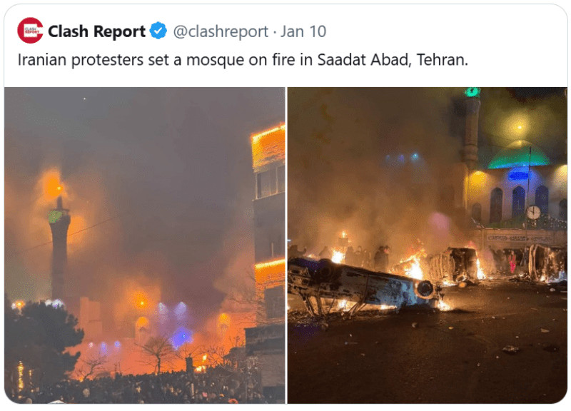Des émeutiers incendient des mosquées (Téhéran, 2026).