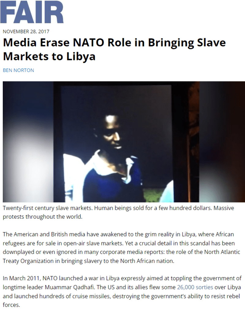 L'OTAN est intervenue après avoir été avertie que Kadhafi préparait un massacre à Benghazi. Des analyses ultérieures menées par le Parlement britannique et le Service de recherche du Congrès américain n'ont trouvé aucune preuve solide d'une atrocité imminente de l'ampleur décrite. La mission s'est rapidement transformée en un changement de régime, au-delà de l'autorisation initiale de la résolution de l'ONU.