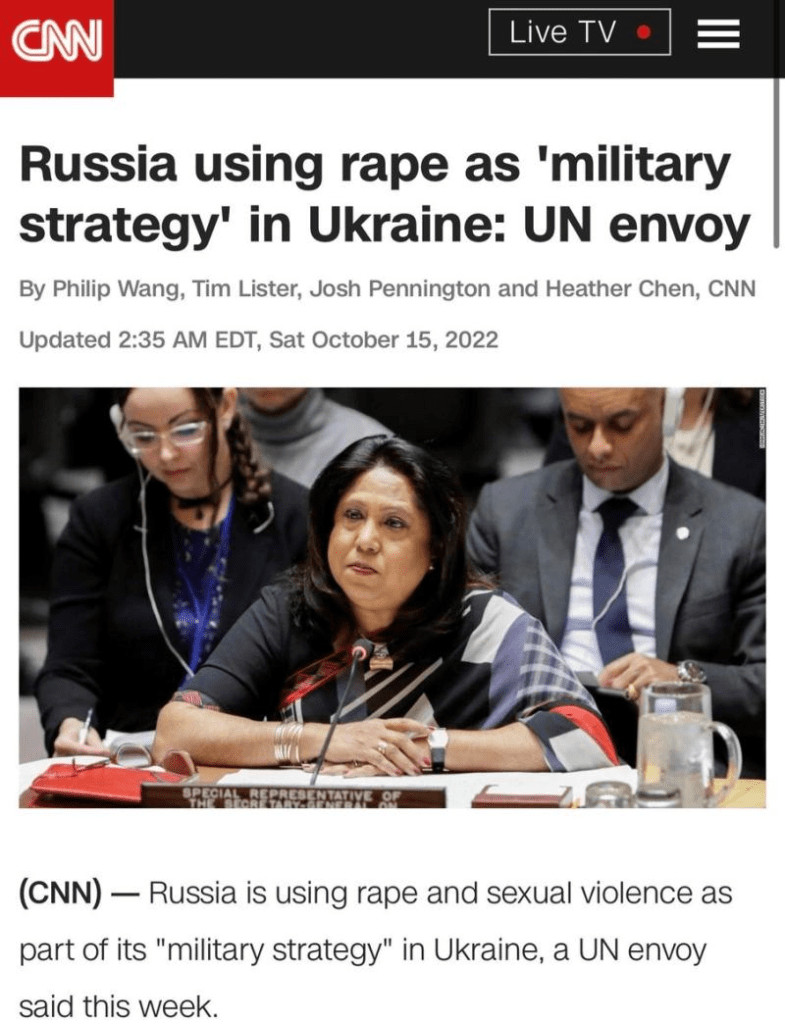 De même, l'Occident a cherché à provoquer un changement de régime en Russie, en collaborant avec le régime de Kiev qu'il a porté au pouvoir lors du coup d'État de 2014 contre le président démocratiquement élu, en diffusant des récits horribles et non fondés sur la Russie et en cherchant même à poursuivre son président pour de prétendus «crimes de guerre». Parmi ces allégations figurait l'affirmation selon laquelle la Russie aurait systématiquement recouru au viol et à la violence sexuelle comme stratégie militaire.