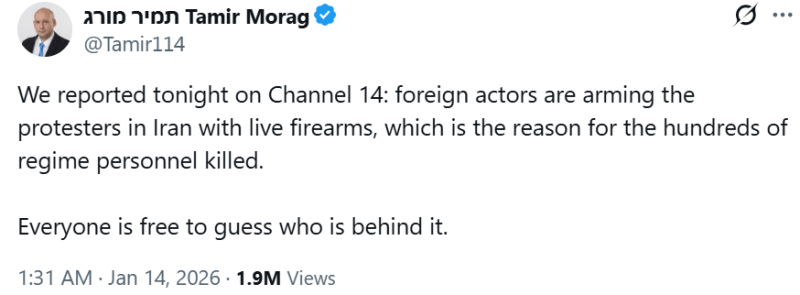 Un journaliste de Channel 14 a déclaré : «Nous avons rapporté ce soir sur Channel 14 : des acteurs étrangers arment les manifestants en Iran avec des armes à feu réelles, ce qui explique la mort de centaines de membres du régime Chacun est libre de deviner qui se cache derrière tout cela», faisant clairement allusion à Israël.