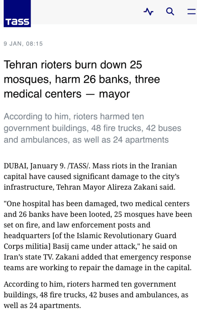 Des groupes violents bien organisés ont rapidement infiltré les manifestations initialement pacifiques début janvier 2026, commettant des meurtres, des incendies criminels et des attaques contre les infrastructures publiques. Les médias occidentaux ont largement ignoré ces actes et ont présenté le mouvement comme étant globalement anti-gouvernemental. L'objectif des émeutiers, à l'instar de celui des États-Unis et d'Israël, était de transformer les manifestations en un soulèvement complet ou en une «révolution», comme l'ont décrit leurs soutiens étrangers.