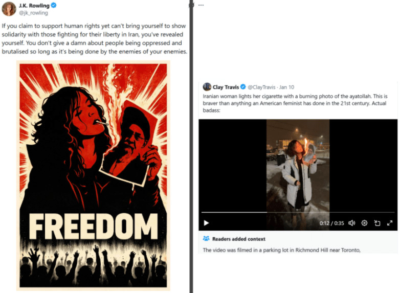 La célèbre romancière britannique J.K. Rowling, autrice de la série Harry Potter composée de sept livres - qui s'est vendue à plus de 600 millions d'exemplaires dans le monde, ce qui en fait la série de livres la plus vendue de tous les temps - a condamné le «régime maléfique» iranien sur X (Twitter), en partageant une affiche basée sur une vidéo montrant prétendument une femme courageuse en Iran «défiant les mollahs». Les internautes ont rapidement identifié le véritable lieu de tournage : Toronto, au Canada, et non l'Iran.