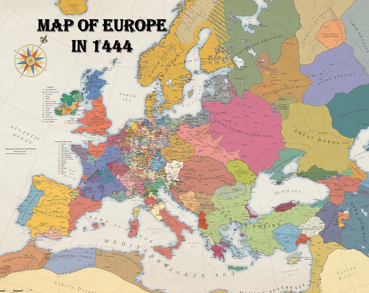 Leggendo un saggio sulla Grande Guerra, scopro come le dinamiche e le debolezze dell'Ue abbiano non poche, inquietanti somiglianze con quelle che fiaccavano l'impero di Francesco Giuseppe alla vigilia dell'attentato di Sarajevo. Se s'imbarca in una guerra contro la Russia, in caso d'insuccesso l'Ue rischia la dissoluzione. Anche l'integrità degli stati dell'Unione potrebbe essere messa in discussione. Gli egoismi, le identità rigide e i linguaggi vuoti non mancano in Europa. La nuova carta dell'Europa post-bellica potrebbe richiamare molto da vicino quella del 1440 (vedi figura sotto), quando la pace di Westfalia (1648) era ancora un miraggio. Sarebbe un esito non troppo sgradito a chi governa le Americhe e l'Estremo Oriente.