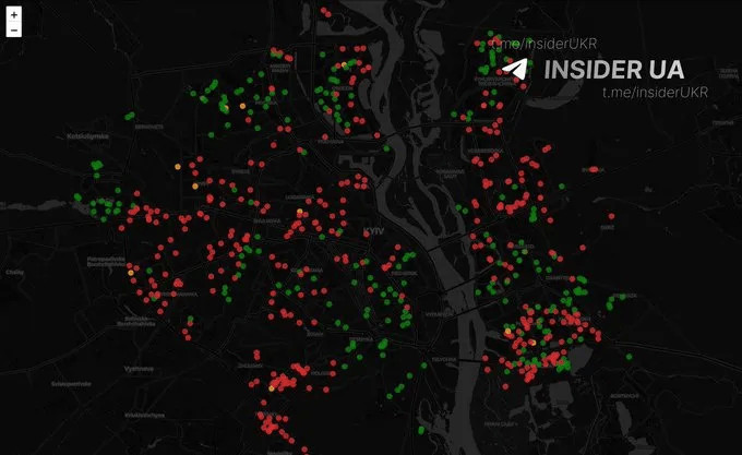 Une source ukrainienne a généré cette carte montrant la panne actuelle à Kiev, le rouge représentant les zones touchées par la panne :
