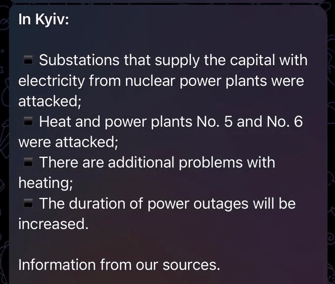 Aujourd'hui encore, nous commençons par une frappe russe majeure qui a eu lieu comme prévu. Dans notre dernier article, il y a deux jours, nous annoncions que la Russie préparait une nouvelle frappe, et elle a tenu parole. Mais le plus remarquable, c'est que cette opération a également confirmé les rumeurs relayées par des experts ukrainiens, comme Serhiy «Flash», selon lesquelles la Russie pourrait bientôt commencer à déconnecter la dernière source d'énergie de l'Ukraine : les centrales nucléaires.