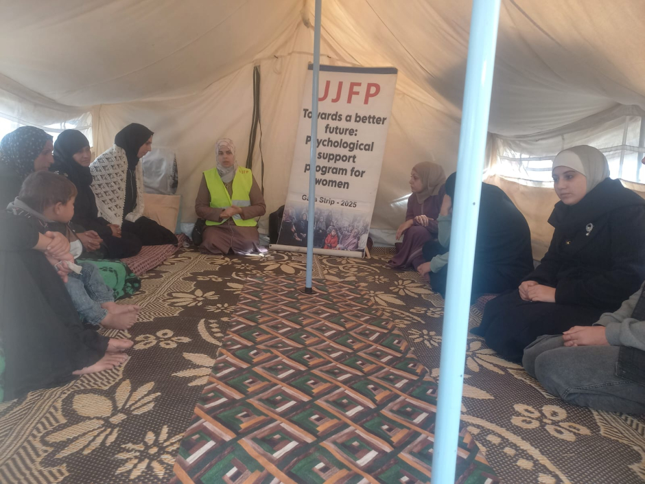 Dans ce cadre, l'équipe de la fondation UJFP a mis en œuvre une séance spécialisée de soutien psychosocial au camp Al-Asdiqa, à l'ouest de Deir al-Balah, dans la région centrale de la bande de Gaza. Vingt femmes déplacées, résidentes du camp, ont participé à cette séance. Elles vivent des conditions humanitaires et psychologiques difficiles en raison de la perte de leurs maisons, de la dispersion des familles et des pressions de la vie quotidienne dans un environnement de déplacement.