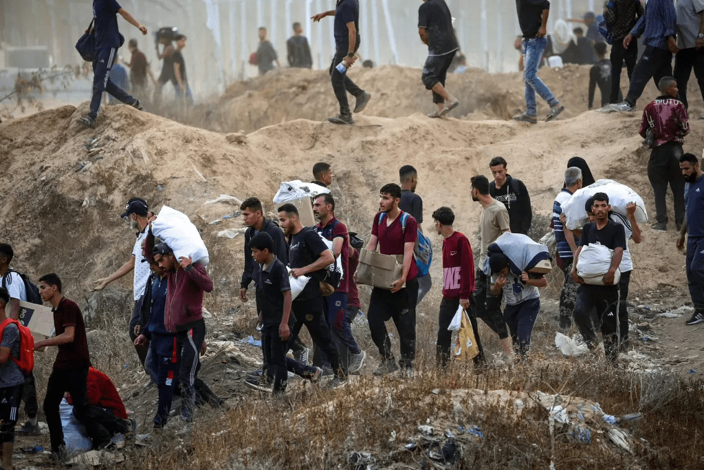 Des adolescents et de jeunes hommes transportent l'aide humanitaire de la Gaza Humanitarian Foundation (GHF) alors que des Palestiniens déplacés reviennent d'un point de distribution dans le centre de Gaza, le 8 juin 2025. Nick Maynard, chirurgien consultant à l'hôpital universitaire d'Oxford, explique comment, avec d'autres médecins de Gaza, il a noté une tendance dans les blessures causées par les tirs des soldats israéliens qui s'entraînent à tirer sur des adolescents dans les sites d'«aide» de la GHF. Crédit photo : Eyad Baba.