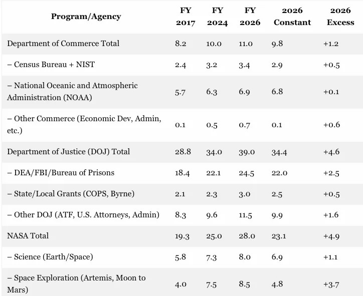 The same can surely be said for the $78 billion provided for FY 2026 in the Commerce/Justice Science bill. Again, this represent a 16% or $11 billion increase to the Obama levels in real terms, but that's not even the half of it.