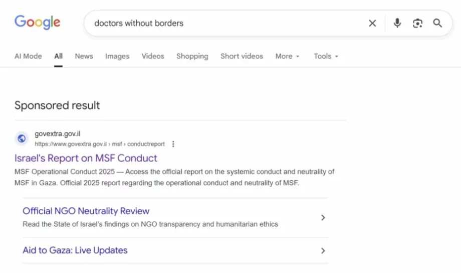 Une publicité israélienne apparaît sur Google au Royaume-Uni lorsque les utilisateurs recherchent « Médecins Sans Frontières » ou « MSF ».