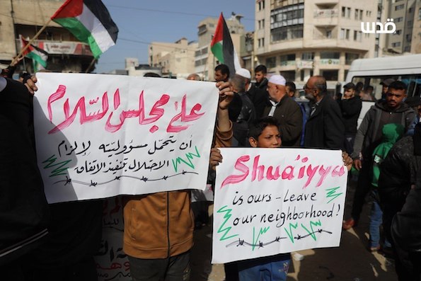 Des Palestiniens ont manifesté à Gaza pour dénoncer l'agression israélienne persistante, les démolitions et les restrictions qui les empêchent de retourner dans leurs foyers situés près de la « ligne jaune », malgré l'annonce de la deuxième phase de l'accord de Charm el-Cheikh.