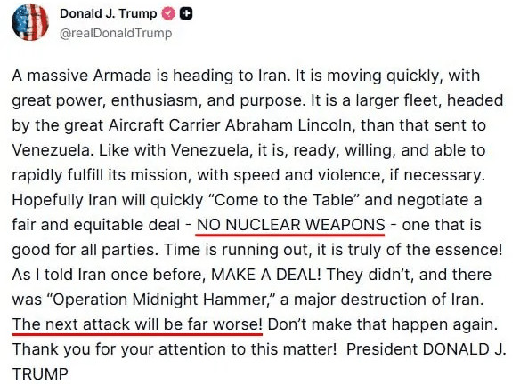 Cette semaine encore, Trump déploie sa flotte à travers le monde vers un nouveau point névralgique géopolitique. Après avoir assuré sa victoire au Venezuela, Donigula tourne à nouveau son armée toute-puissante vers l'Iran.