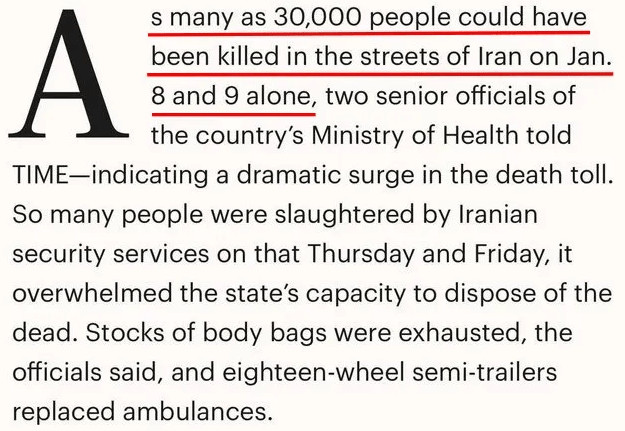 Par exemple, on nous dit qu'un nombre absurde de Russes meurent en Ukraine, au point d'en être caricatural. À présent, les médias traditionnels nous informent que 30 000 civils iraniens ont été «tués par le régime» en un ou deux jours de «manifestations».