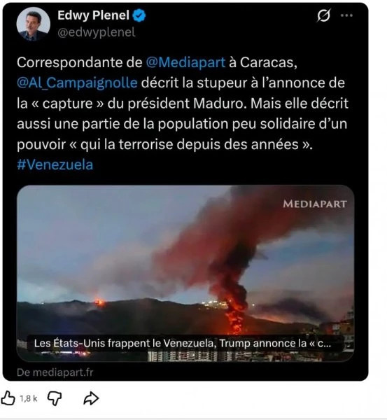 Co-auteur de Che Guevara : une braise qui brûle encore (Mille et une nuits, 2007), Olivier Besancenot lève un poing audacieux tout en évitant précautionneusement de brûler ses petits doigts dans la braise : « Le NPA-l'Anticapitaliste soutient le droit à l'autodétermination du peuple vénézuélien. C'est à lui de décider s'il doit emprisonner ou non Maduro, et non au gouvernement américain ». Besancenot ne précise pas si les Vénézuéliens doivent également envisager l'incarcération de Delcy Rodríguez, proche collaboratrice de Maduro. Le côté féministe du dirigeant néo-trotskiste, vraisemblablement (bien que le sort de Cilia Flores ne semble guère le préoccuper).