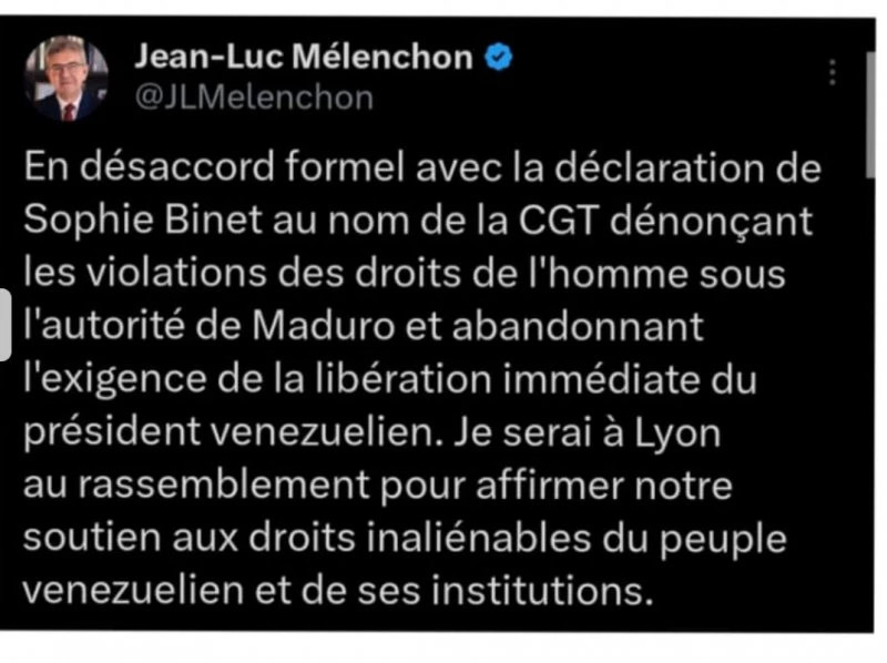 Une manifestation organisée le 10 janvier à Paris, au Trocadéro, par le Collectif international pour la paix au Venezuela - 36 organisations solidaires latino-américaines et africaines [26] - est boycottée par les notables « anti-impérialistes » et la « contra » [27] françaises. Au cours d'une réunion convoquée par le bureau politique de France Amérique latine, il est décidé que la CGT, sous l'autorité de sa secrétaire générale Sophie Binet, appellera à un rassemblement « unitaire » parallèle, à la même heure, à La Bastille, pour dénoncer l'intervention américaine, mais sans réclamer la libération du président vénézuélien.