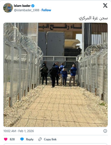 Quds News Network, 1er février 2026.- Une photo du point de passage de Rafah entre Gaza et l'Égypte, circulant sur les réseaux sociaux, montre l'entrée grillagée de ce point de passage, deux ans après le génocide. Un nombre limité de Palestiniens sera autorisé à y entrer et à en sortir, sous réserve de contrôles de sécurité et d'un point de contrôle militaire israélien.