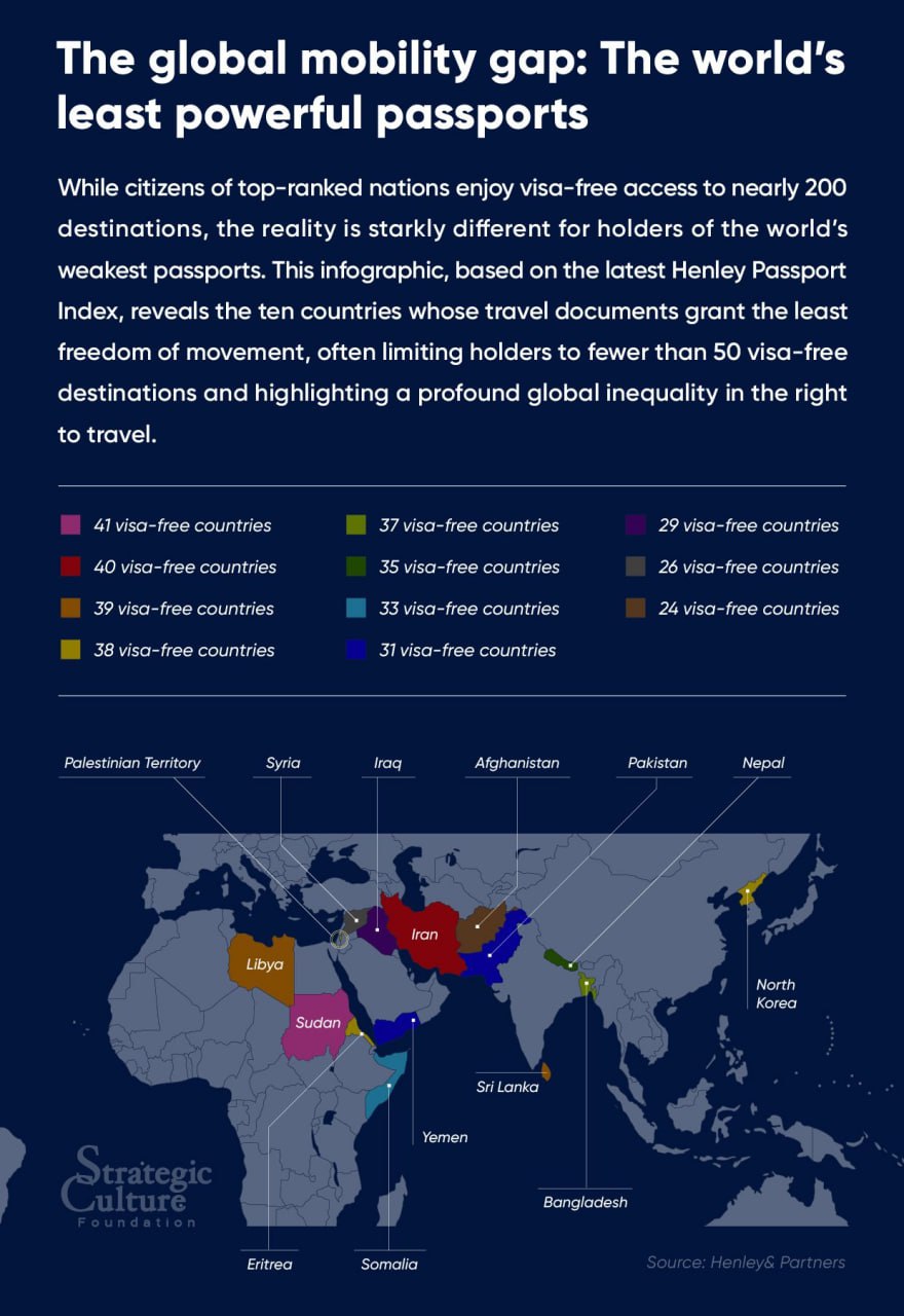 While citizens of top-ranked nations enjoy visa-free access to nearly 200 destinations, the reality is starkly different for holders of the world's weakest passports. This infographic, based on the latest Henley Passport Index, reveals the ten countries whose travel documents grant the least freedom of movement, often limiting holders to fewer than 50 visa-free destinations and highlighting a profound global inequality in the right to travel.