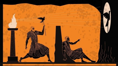 «Imaginez des gens comme s'ils étaient dans une habitation souterraine semblable à une caverne, avec une entrée ouverte vers la lumière tout le long de sa longueur. Depuis leur enfance, ils ont des chaînes aux jambes et au cou, de sorte qu'ils doivent rester à la même place et ne voir que ce qui est directement devant eux, car ils ne peuvent pas tourner la tête à cause de ces liens. Derrière eux, tout en haut, brûle la lumière d'un feu, et entre le feu et les prisonniers court une voie supérieure, sur laquelle, imaginez, une faible muraille a été construite, comme le paravent placé devant les spectateurs de merveilles, derrière lequel ils exhibent leurs prodiges».