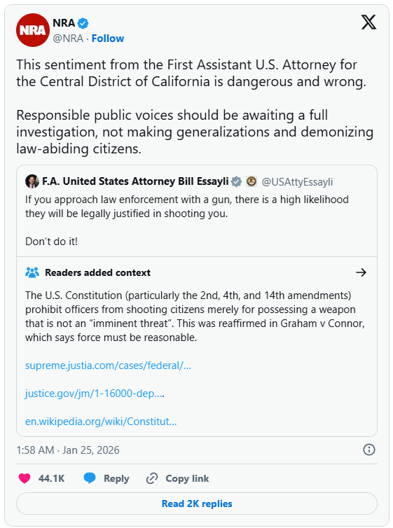 The NRA struck a different tone the same day when Bill Essayli, a Republican and first assistant U.S. attorney in California, posted on X: "If you approach law enforcement with a gun, there is a high likelihood they will be legally justified in shooting you."